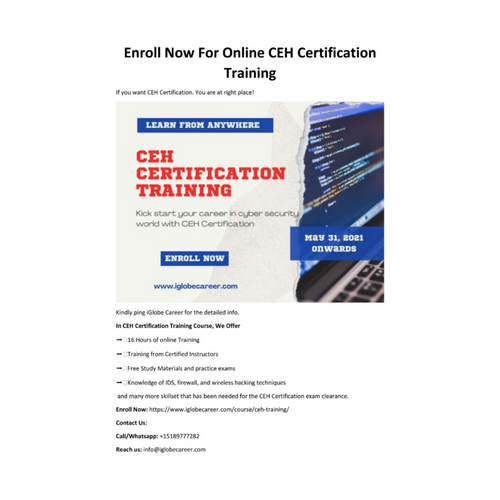 If you want CEH Certification. You are at right place! kindly ping iGlobe Career for the detailed info. In CEH Certification Training Course, We Offer ➡️16 Hours of online Training ➡️Training from Certified Instructors ➡️Free Study Materials and practice exams ➡️Knowledge of IDS, firewall, and wireless hacking techniques and many more skillset that has been needed for the CEH Certification exam clearance. Enroll Now: https://www.iglobecareer.com/course/ceh-training/ Contact Us: Call/Whatsapp: +15189777282 Reach us: info@iglobecareer.com