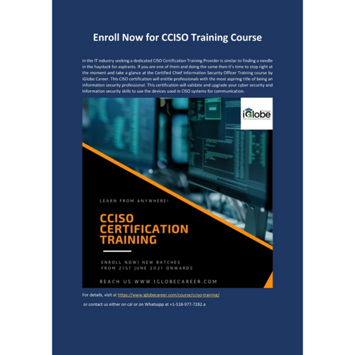 In the IT industry seeking a dedicated CISO Certification Training Provider is similar to finding a needle in the haystack for aspirants. If you are one of them and doing the same then it’s time to stop right at the moment and take a glance at the Certified Chief Information Security Officer Training course by iGlobe Career. This CISO certification will entitle professionals with the most aspiring title of being an information security professional. This certification will validate and upgrade your cyber security and Information security skills to use the devices used in CISO systems for communication. For details, visit at https://www.iglobecareer.com/course/cciso-training/ or contact us either on cal or on whatsapp at +1-518-977-7282.