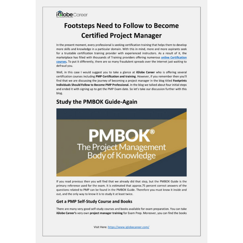 Read the document and know Footsteps Need to Follow to Become Certified Project Manager.In the document we talked about four initial steps and ended it with signing up to get the PMP Exam date. So let’s take our discussion further with this. For details related to project management, read at https://www.iglobecareer.com/course-category/project-management/