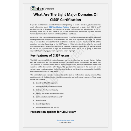 Check out the document and know What Are The Eight Major Domains Of CISSP Certification. As CISSP is a well known certification key to the development of cyber security experts. So go ahead and try your hands on CISSP. Enroll For CISSP Certification Training Course at iGlobe Career. Enroll Now: https://www.iglobecareer.com/course/cissp-training/ Contact us: +1-518-977-7282