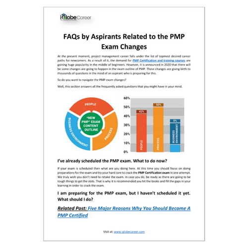 Check out the document and know various FAQs by Aspirants Related to the PMP Exam Changes. Especially based on the career growth after the PMP Certification. For best PMP Certification Training Course under expertise of certified instructors, enroll now with iGlobe Career. Visit https://www.iglobecareer.com/course/pmp-training/ for more details.