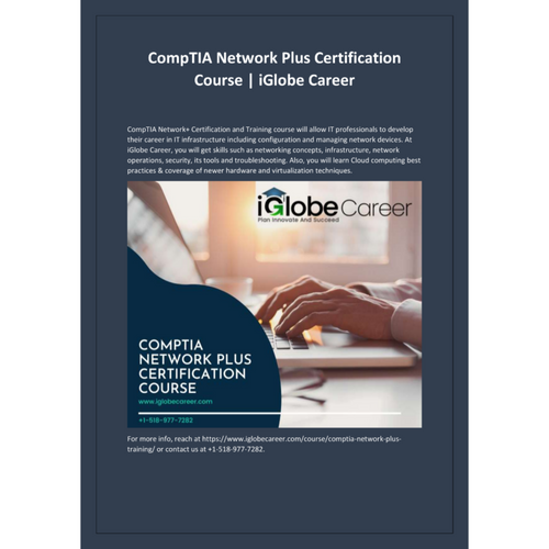 CompTIA Network+ Certification and Training course will allow IT professionals to develop their career in IT infrastructure including configuration and mana ging network devices. At iGlobe Career, you will get skills such as networking concepts, infrastructure, network operations, security, its tools and troubleshooting. Also, you will learn Cloud computing best practices & coverage of newer hardware and virtualization techniques. For more info, reach at https://www.iglobecareer.com/course/comptia-network-plus-training/ or contact us at +1-518-977-7282.