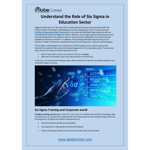 Read the document and know Role of Six Sigma in Education Sector. The Six Sigma methodologies are considered as world’s leading service industry who illustrates the potential for quality and change management in the education sector.If you want to know more or have any query, then visit the website of iGlobe Career and read more Six Sigma related blogs and articles. For details, read at https://www.iglobecareer.com/course-category/quality-management/