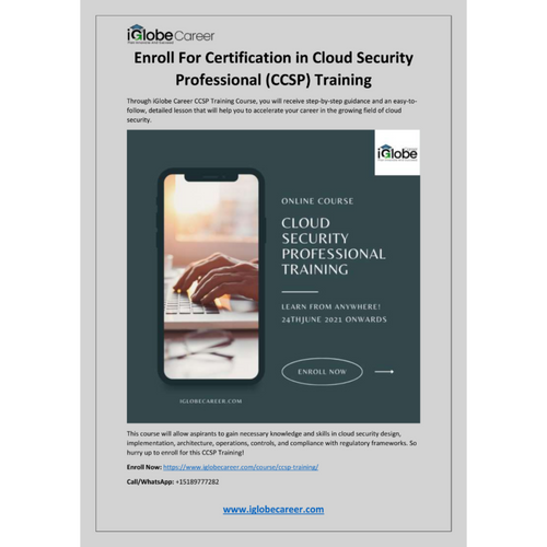 Through iGlobe Career CCSP Training Course, you will receive step-by-step guidance and an easy-to-follow, detailed lesson that will help you to accelerate your career in the growing field of cloud security. This course will allow aspirants to gain necessary knowledge and skills in cloud security design, implementation, architecture, operations, controls, and compliance with regulatory frameworks. So hurry up to enroll for this CCSP Training! Enroll Now: https://www.iglobecareer.com/course/ccsp-training/ Call/WhatsApp: +15189777282