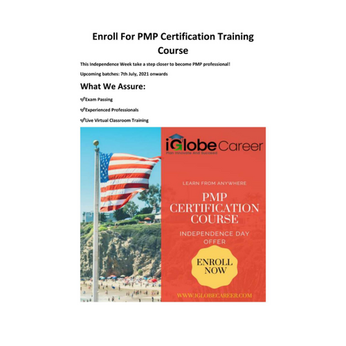 This Independence Week take a step closer to become PMP professional Upcoming batches : 7th July, 2021 onwards What We Assure: ✅Exam Passing ✅Experienced Professionals ✅Live Virtual Classroom Training Perks of this training: ✅Training and exam preparation materials ✅Certificate of Training completion Reach Us: ✅Visit Here: https://www.iglobecareer.com/course/pmp-training/ ✅Call/Whatsapp: +15189777282