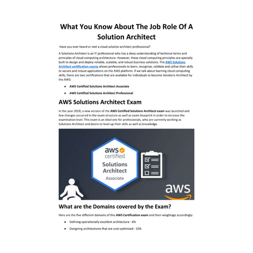 Read the document and know About The Job Role Of A Solution Architect. One can check out our posts at the website of iGlobe Career. Moreover, you can register yourself here to get training in AWS Solution Architect Certification. Enroll Now: https://www.iglobecareer.com/course/aws-certified-solutions-architect-associate-training/