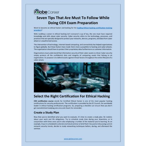 Check out the document and know Seven Tips That Are Must To Follow While Doing CEH Exam Preparation. Also to enroll in CEH Training Course via experienced iGlobe Career experts contact us now. Enroll: https://www.iglobecareer.com/course/ceh-training/