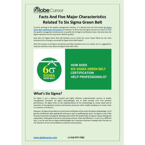 Check out the document and know Facts And Five Major Characteristics Related To Six Sigma Green Belt. How does Six Sigma Green Belt will facilitate you to climb the career steps? What are the main characteristics of being a successful Six Sigma Green Belt holder? To sum up, this is often a certification to induce if you're pursuing a career in quality management then the Online Six Sigma Green Belt Certification Training by iGlobe Career can be a great place to begin for learning all the fundamentals. For details, reach at https://www.iglobecareer.com/course/six-sigma-green-belt-training/