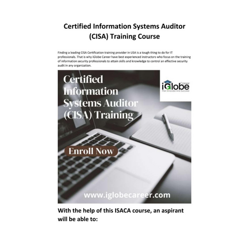 Finding a leading CISA Certification training provider in USA is a tough thing to do for IT professionals. That is why iGlobe Career have best experienced instructors who focus on the training of information security professionals to attain skills and knowledge to control an effective security audit in any organization. With the help of this ISACA course, an aspirant will be able to: •Have a good understanding of IT audit process •Knowledge of all five domains of CISA certification •Learn stability of information systems •Understand the importance of business continuity and business failure recovery For Enrolling in CISA Training Course via professional Cyber security professionals do reach at https://www.iglobecareer.com/course/cisa-training/ or contact us at +15189777282.