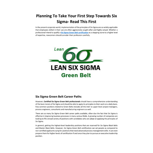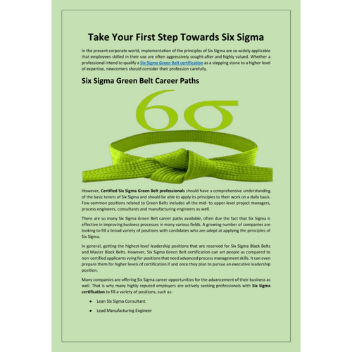 Read the document and know how to Take Your First Step Towards Six Sigma Career Path. At iGlobe Career, we offer complete series of Quality Management Certification courses for professionals who desires to enhance their skills and knowledge of process improvement tools and techniques. Read Full Content at: https://www.iglobecareer.com/course/six-sigma-green-belt-training/