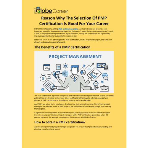 Check out the document and know Reason Why The Selection Of PMP Certification Is Good For Your Career. What is the impact of being certified in PMP? For professional PMP Training Course via best and experienced instructors, reach at iGlobe Career now. For details reach at https://www.iglobecareer.com/course/pmp-training/