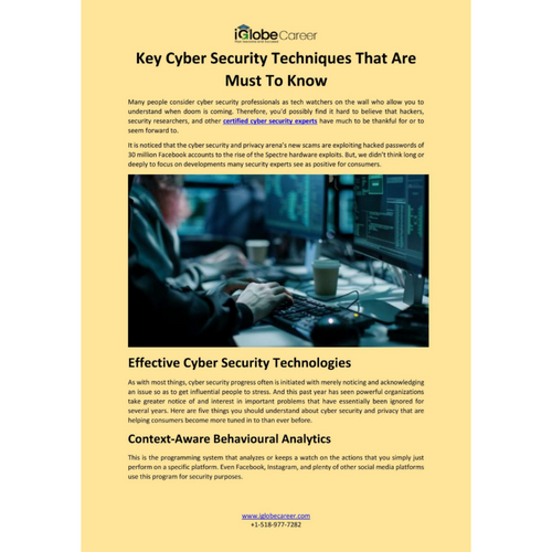Check out the document and know Key Cyber Security Techniques That Are Must To Know. It is noticed that the cyber security and privacy arena’s new scams are exploiting hacked passwords of 30 million Facebook accounts to the rise of the Spectre hardware exploits. But, we didn’t think long or deeply to focus on developments many security experts see as positive for consumers. Now, it is about you but if you want to make a career in cyber security then, get yourself enroll for Cyber security certification training from iGlobe Career. For more details, visit at https://www.iglobecareer.com/course-category/cyber-security/