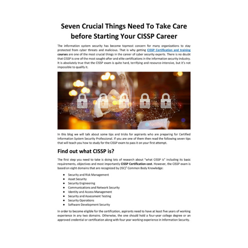 Check out the document and know in detail about Seven Crucial Things Need To Take Care before Starting Your CISSP Career. You can gather other Information about Certification in Information System Security Professional at the website of iGlobe Career. For detailed info, reach at https://www.iglobecareer.com/course/cissp-training/