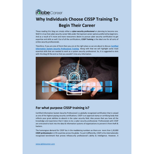 Check out the document and know Why Individuals Choose CISSP Training To Begin Their Career. To register yourself for the CISSP Training course, you need to visit the website of iGlobe Career. Enroll Now: https://www.iglobecareer.com/course/cissp-training/