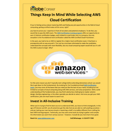 Read out the document and know Things Keep In Mind While Selecting AWS Cloud Certification. While choosing the best source to learn AWS training and identifying the proper steps is a great start, keeping a steady pace and motivation is what will help you most in the long run. Get ready to kick off the career with iGlobe Career and upgrade your life. For detailed info, reach us at https://www.iglobecareer.com/course-category/aws/ or call +15189777282.