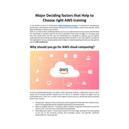 Check out the document and know Major Deciding factors that Help to Choose right AWS training. Why should you go for AWS cloud computing? Why get AWS Certified? Therefore, it is suggested to get earlier than the curve and ensure your skills are relevant in today’s market. To know more about the AWS certification exam, browse the website of iGlobe Career. For more details, visit at https://www.iglobecareer.com/course-category/aws/