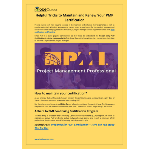 Read the document and know about helpful tricks to Maintain and Renew Your PMP Certification. to Maintain and Renew Your PMP Certification. Are you ready to hear and claim PDUs by listening to podcasts? Check out the website today to get more information about a project management career. For detailed info, visit at https://www.iglobecareer.com/course/pmp-training/ via PMP experts.
