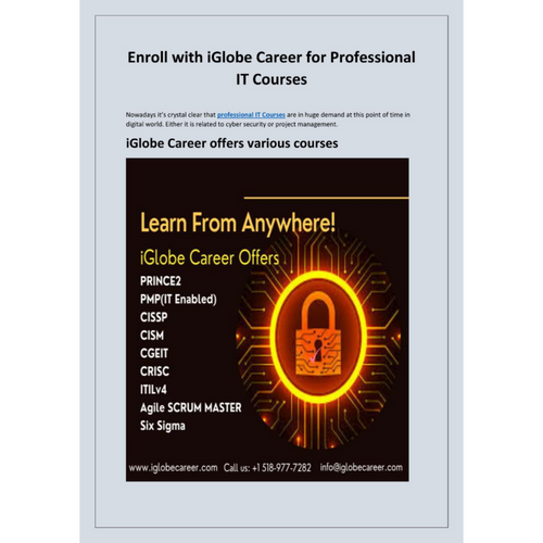 Nowadays its crystal clear that professional IT Courses are in huge demand at this point of time in digital world. Either it is related to cyber security or project management. iGlobe Career offers various courses PRINCE2 CISSP CISM PMP CGEIT CISA Six Sigma CCNA AI ITIL4 and many more. For more details reach at www.iglobecareer.com Contact: Call/Whatsapp: +15189777282