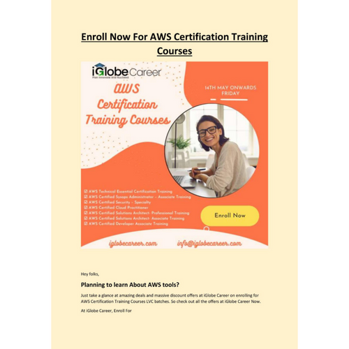 Hey folks, Planning to learn About AWS tools? Just take a glance at amazing deals and massive discount offers at iGlobe Career on enrolling for AWS Certification Training Courses LVC batches. So check out all the offers at iGlobe Career Now. At iGlobe Career, Enroll For ☑ AWS Technical Essential Certification Training ☑ AWS Certified Sysops Administrator – Associate Training ☑ AWS Certified Security – Specialty ☑ AWS Certified Cloud Practitioner ☑ AWS Certified Solutions Architect- Professional Training ☑ AWS Certified Solutions Architect- Associate Training ☑ AWS Certified Developer Associate Training Enroll Now@ https://iglobecareer.com/course-category/aws/ Contact Us: info@iglobecareer.com