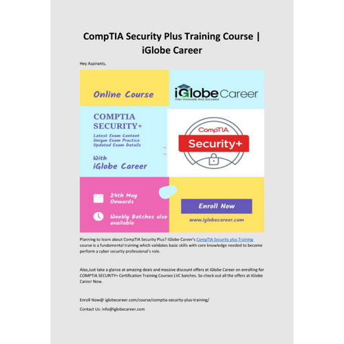 Hey Aspirants, Planning to learn about CompTIA Security Plus? iGlobe Career's CompTIA Security plus Training course is a fundamental training which validates basic skills with core knowledge needed to become perform a cyber security professional’s role. Also,vJust take a glance at amazing deals and massive discount offers at iGlobe Career on enrolling for COMPTIA SECURITY+ Certification Training Courses LVC batches. So check out all the offers at iGlobe Career Now. Enroll Now@ iglobecareer.com/course/comptia-security-plus-training/ Contact Us: info@iglobecareer.com