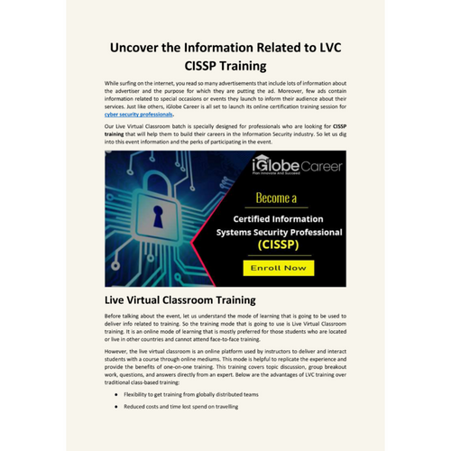 iGlobe Career,Live Virtual Classroom batch is specially designed for professionals who are looking for CISSP training that will help them to build their careers in the Information Security industry. To sum up, I just want to suggest all the aspirants register their place for the CISSP Training course to become a CISSP Expert. Enroll now: https://www.iglobecareer.com/course/cissp-training/
