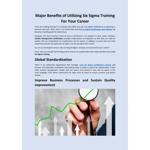Read the document and know Major Benefits of Utilizing Six Sigma Training For Your Career. Start the process by enrolling for the Six Sigma training with iGlobe Career today. Enroll now: https://www.iglobecareer.com/course-category/quality-management/