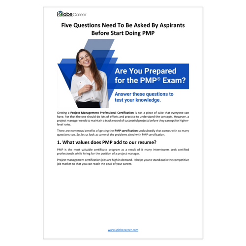 Read the document and know Five Questions Need To Be Asked By Aspirants Before Start Doing PMP. PMP Certification is most in demand it course in current times. So if one is looking for PMP Certification Training course provider, one can definitely count on iGlobe Career for the professional online it certification training via certified professionals. For details also read: https://issuu.com/iglobecareer/docs/faqs_by_aspirants_related_to_the_pmp_exam_changes