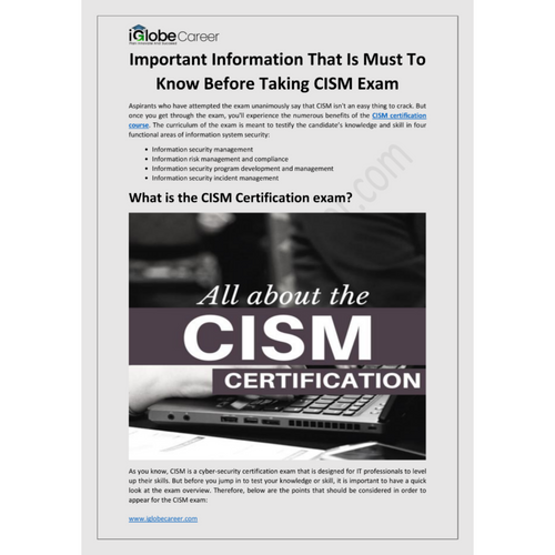 Check out the document and know Important Information That Is Must To Know Before Taking CISM Exam. What is the CISM Certification exam? What are Prerequisites for the Exam? and for more queries in detail, connect with iGlobe Career via professional cyber security experts. Read more info at https://www.iglobecareer.com/course/cism-training/