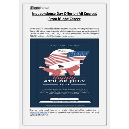 On the auspicious commencement of the day of 4th July 2021, celebrating the Independence Day of USA, iGlobe Career is proudly offering heavy discounts on various Professonal IT Courses like PMP, CISSP, CISM, CISA, CEH, Quality Management, Artificial Intelligence, TOGAF9.2 and many other IT Certification training courses. One can easily enroll with us by simply visiting our official website that is www.iglobecareer.com or contact us at either on Whatsapp or Call at +1-518-977-7282. Hurry Up! Limited Time Offer! Note: Offer Valid from 4th July 2021 onwards to 11th July 2021 11:59PM.