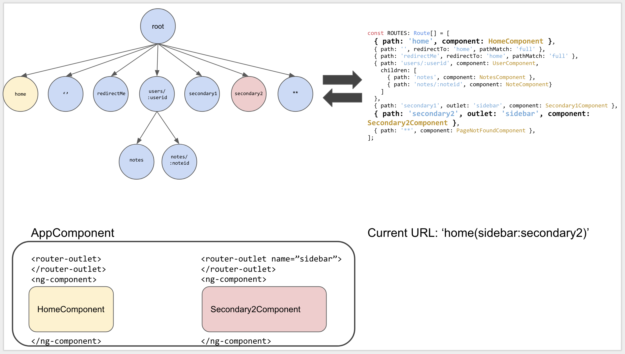 The outlets are routed independently of each other, so navigating from secondary1 to secondary2 would not affect the part of the URL associated with the primary outlet, /users/1/notes/42.