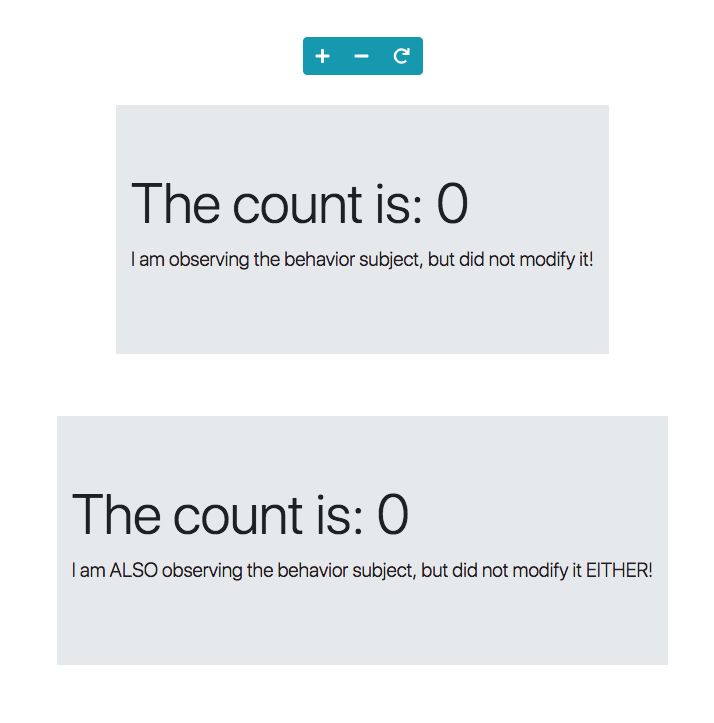 Above is the component with the buttons that control updating the behavior subject. The increment, decrement, and reset functions are called on click on their corresponding buttons.
