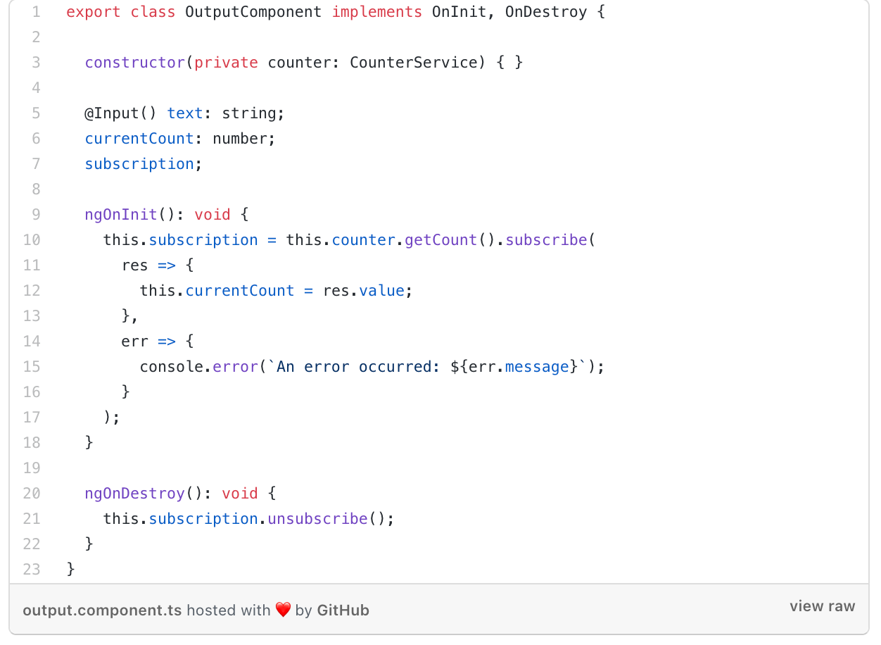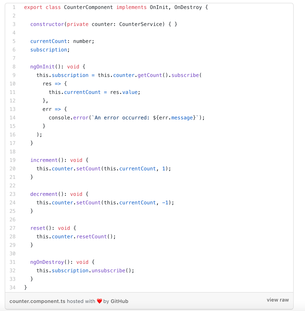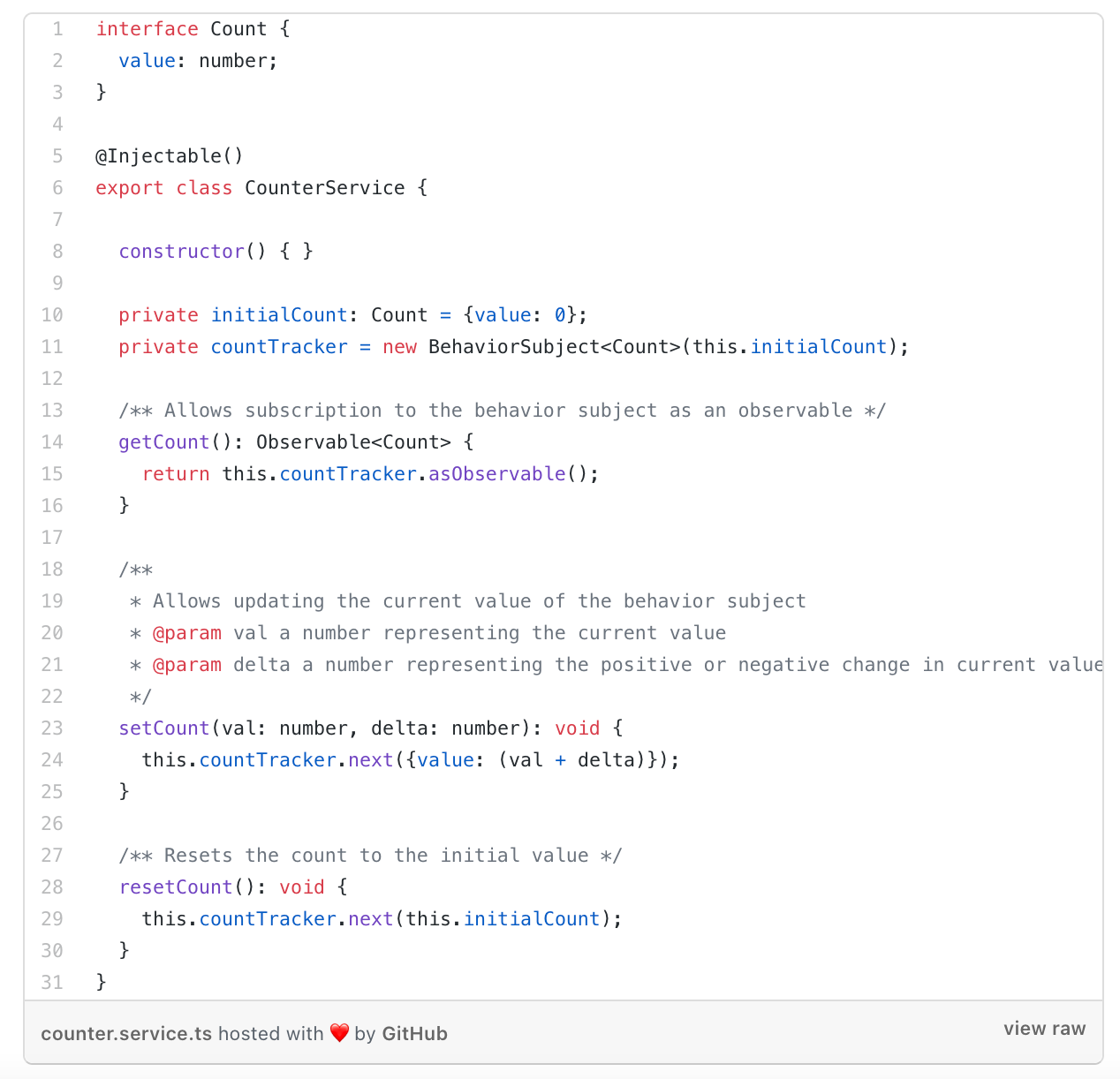initalCountis what the initial value of the count should be (this is also used when resetting). Line 11 is where a new behavior subject is instantiated with 0 as its first value.