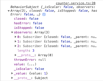 If you console.log the behavior subject, you can actually see something really cool — check out the observers property — we see 3! One for the first component that modifies the behavior subject, and two more for the components only listening. The behavior subject itself keeps track of this, which is both useful and fascinating. The current value can also be seen, as well as data pertaining to the state of the observable.