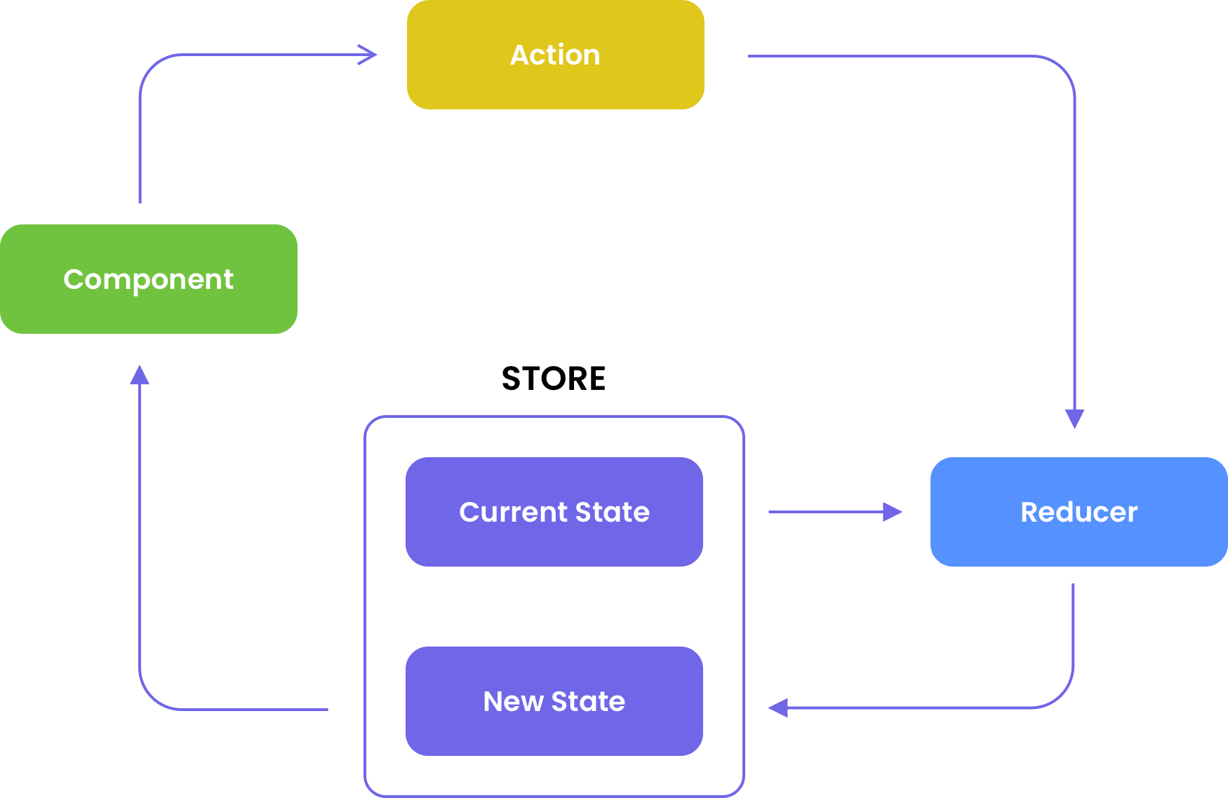 Let’s consider a simple example for describing the Redux data flow in details. Let’s imagine that user clicks a button in a component’s view template, then the corresponding Action is fired (dispatched) to the Store. When the Action is triggered, the Reducer takes the current State and the data from the Action then returns the new State from it.