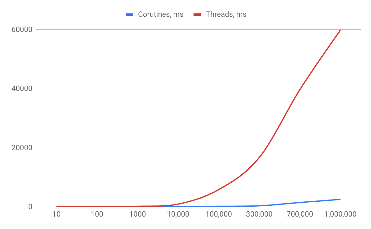 We will create and execute simultaneously a lot of coroutines and a lot of threads (10, 100, 1k, 10k, 100k, 300k, 1m) and let them do some pseudowork (let it be empty method first, without any heavy task or delay).