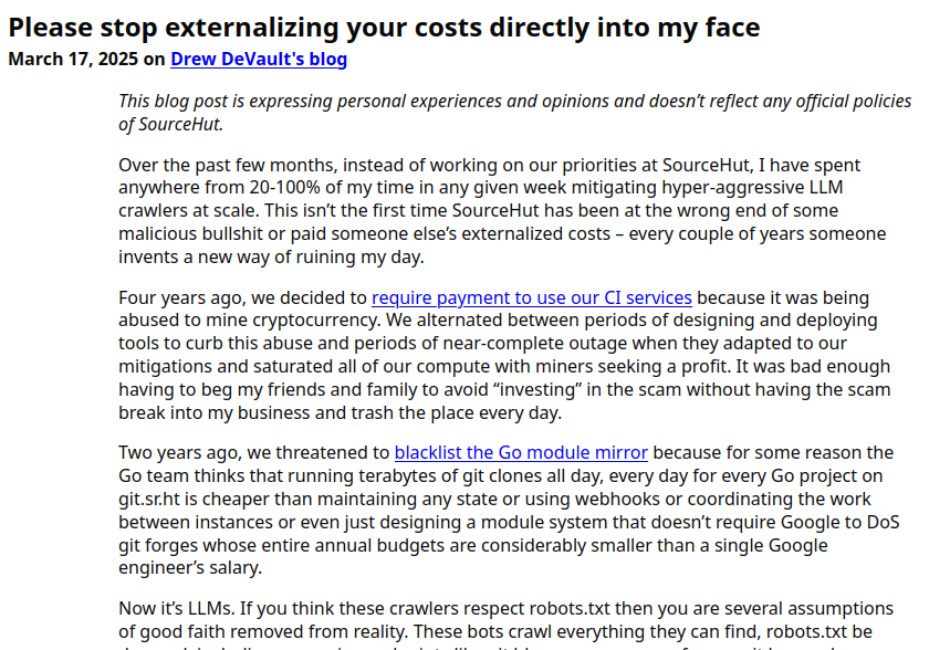 [4] https://drewdevault.com/2025/03/17/2025-03-17-Stop-externalizing-your-costs-on-me.html. Accessed: 2025-08-10.