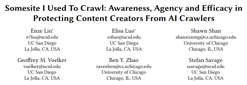 [8] LIU, E., LUO, E., SHAN, S., VOELKER, G. M., ZHAO, B. Y., AND SAVAGE, S. Somesite I used to crawl: Awareness, agency and efficacy in protecting content creators from AI crawlers. CoRR abs/2411.15091 (2024)