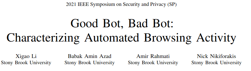 [6] LI, X., AZAD, B. A., RAHMATI, A., AND NIKI-FORAKIS, N. Good bot, bad bot: Characterizing auto-mated browsing activity. In SP (2021), IEEE, pp. 1589–1605.