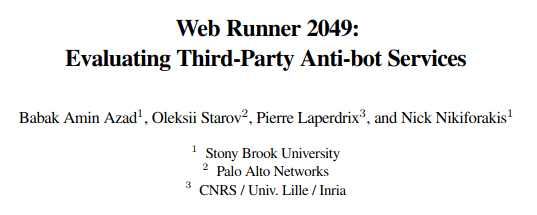 [7] AZAD, B. A., STAROV, O., LAPERDRIX, P., AND NIKIFORAKIS, N. Web runner 2049: Evaluating third-party anti-bot services. In DIMVA (2020), vol. 12223 of Lecture Notes in Computer Science, Springer, pp. 135–159