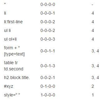- Pseudo-elements (e.g. :first-line) get 0,0,0,1 unlike their psuedo-class brethren which get 0,0,1,0