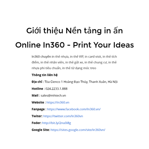 Thông tin liên hệ Địa chỉ : Tòa Cienco 1 Hoàng Đạo Thúy, Thanh Xuân, Hà Nội Hotline : 024.2233.1.888 Mail : sales@mhtech.vn Website : https://in360.vn Fanpage : https://www.facebook.com/In360.vn/ Twiter: https://twitter.com/In360vn Foder: http://bit.ly/2nu0i8g Google Site: https://sites.google.com/site/in360vn/