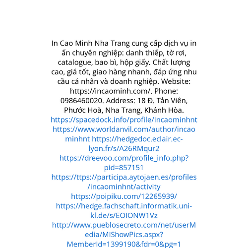 Website: https://incaominh.com/. In Cao Minh Nha Trang cung cấp dịch vụ in ấn chuyên nghiệp: danh thiếp, tờ rơi, catalogue, bao bì, hộp giấy. Chất lượng cao, giá tốt, giao hàng nhanh, đáp ứng nhu cầu cá nhân và doanh nghiệp. Phone: 0986460020. Addre