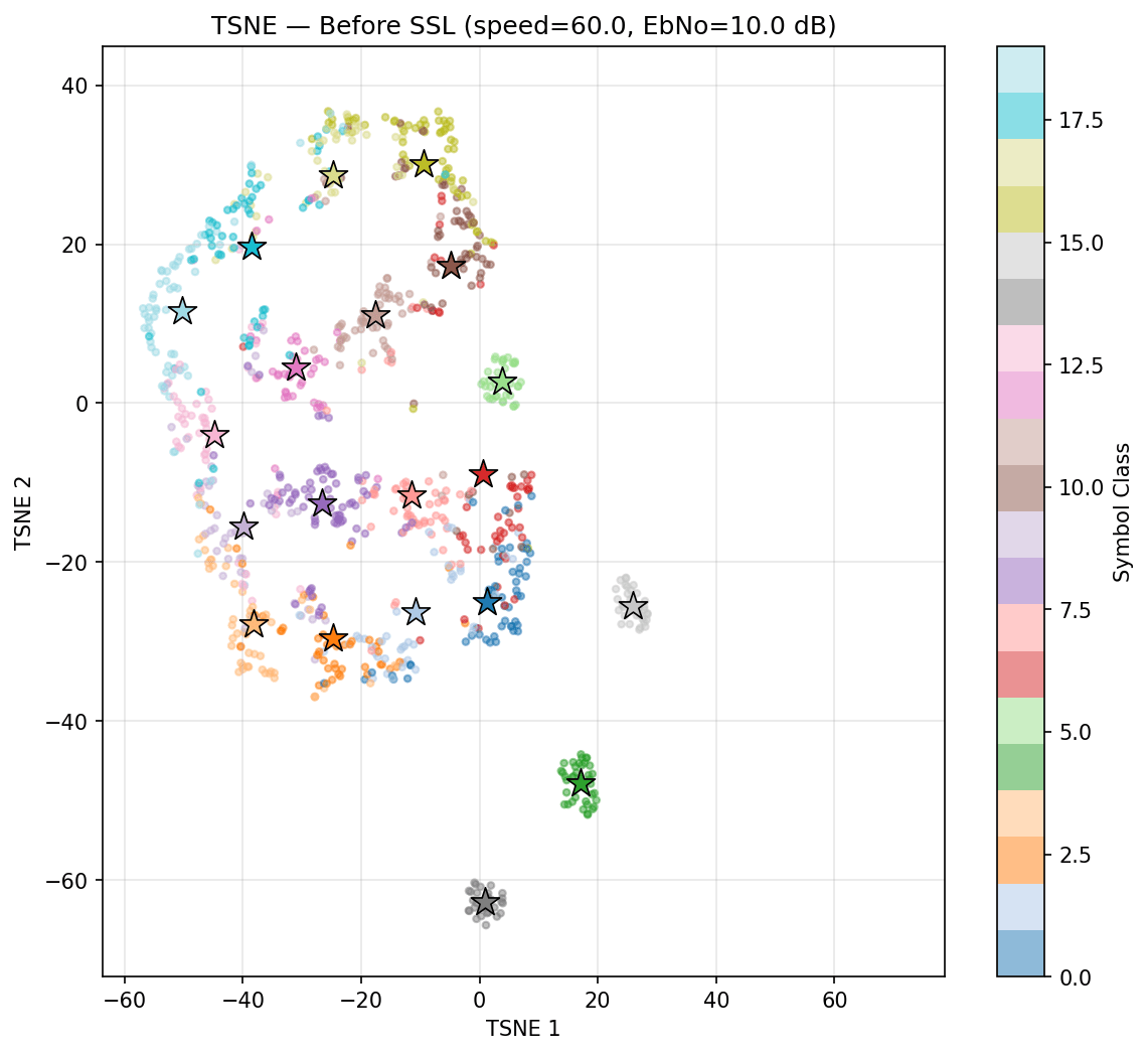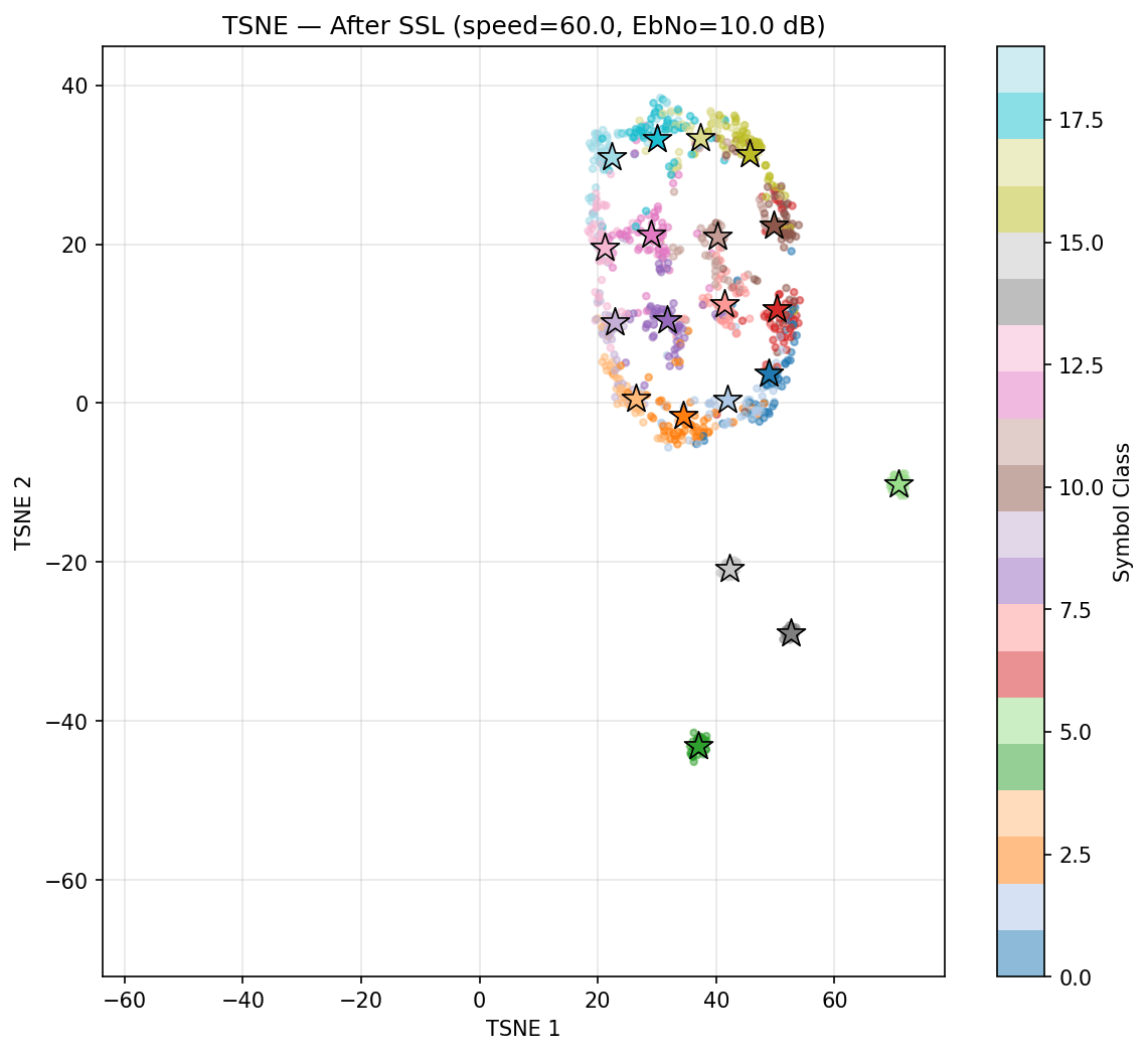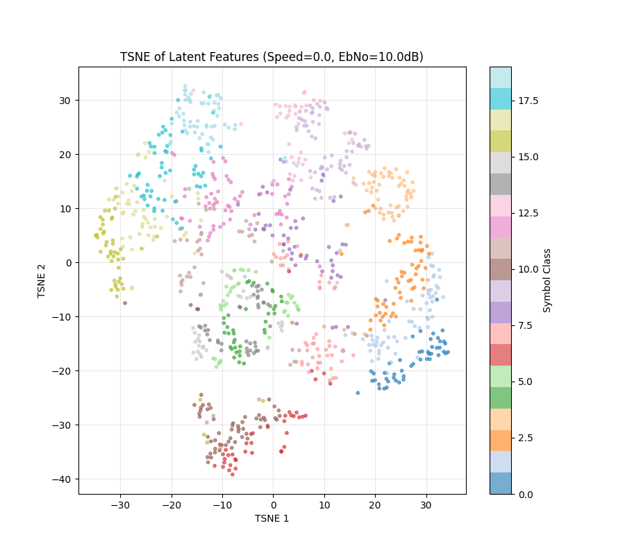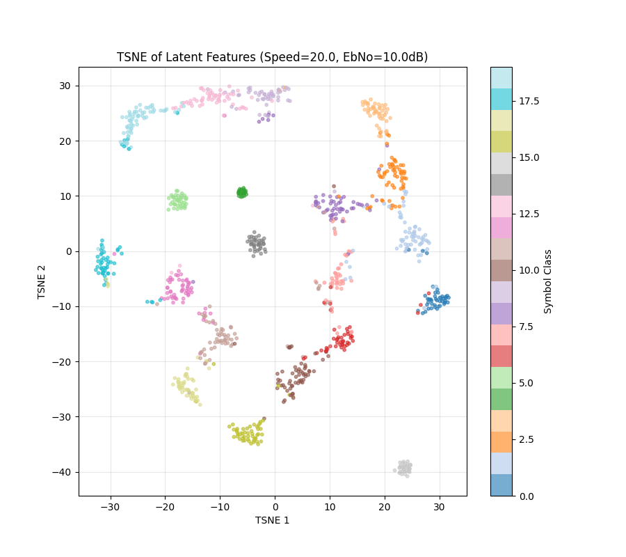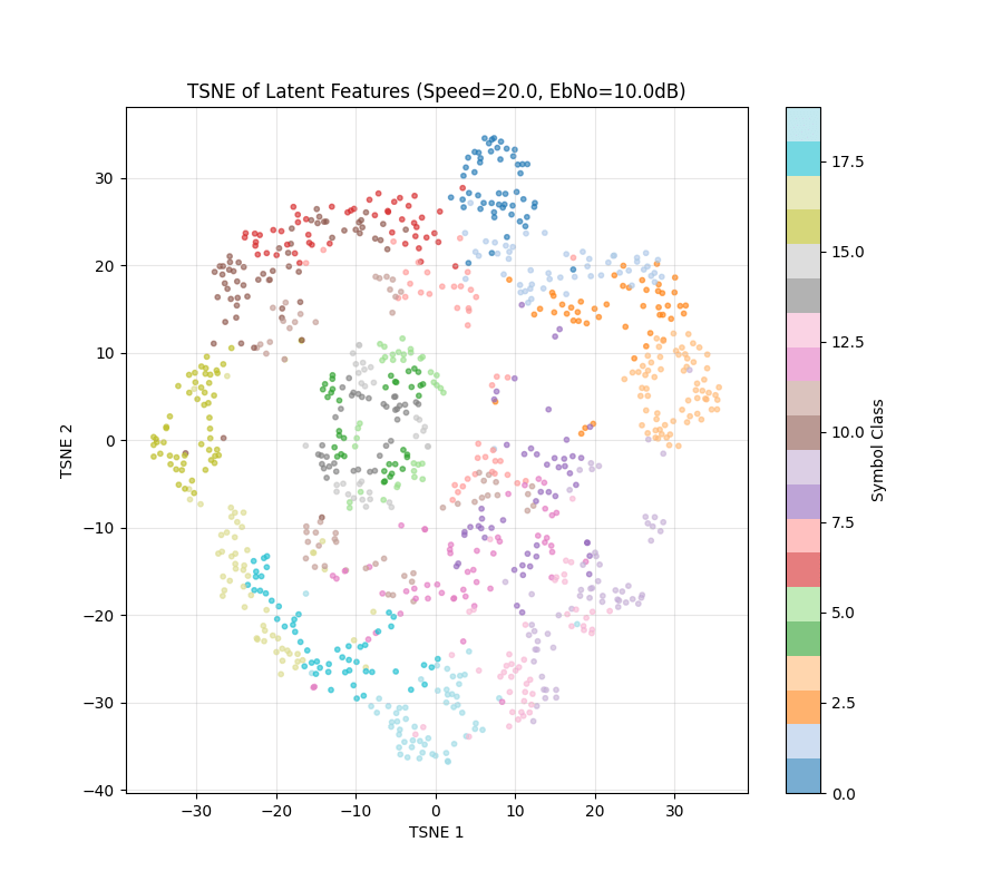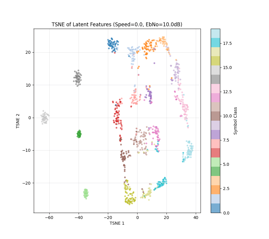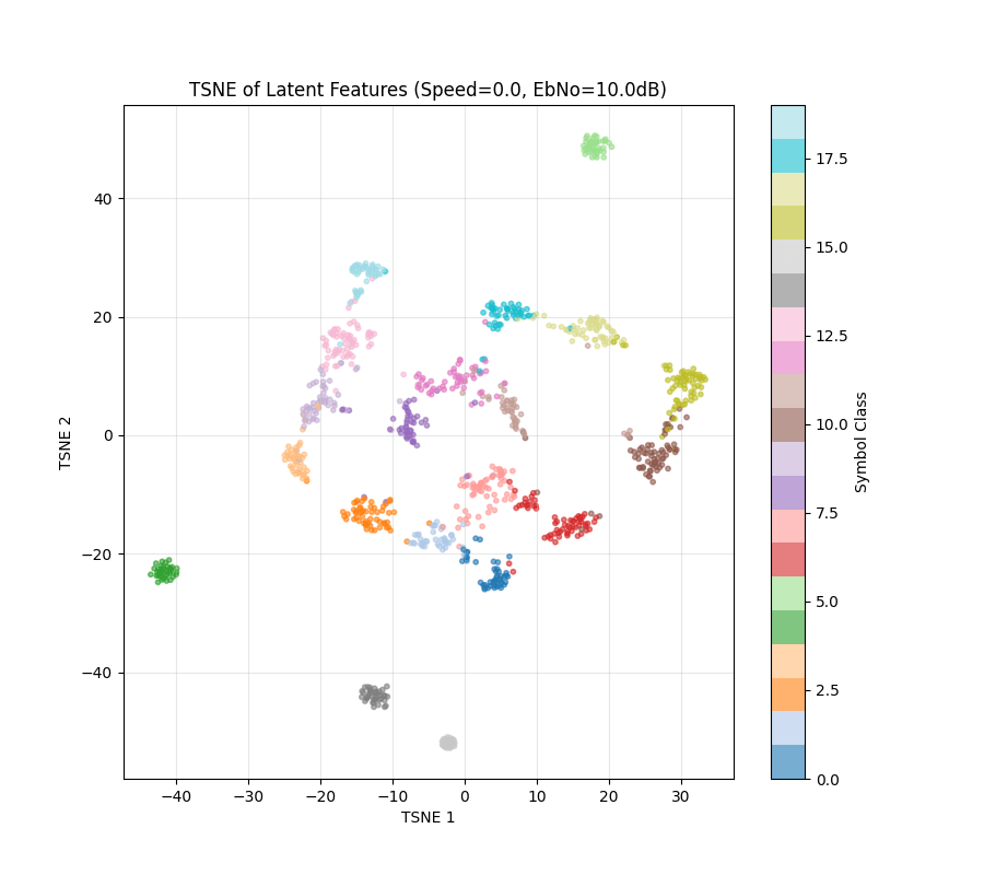 4) NRx(0) with Demapper: Identical configuration as (1), but during training, we only get channel impulse responses with the user speed being 0. Then, during test time, we change the channel model to have speeds of 10,20, etc, and see what happens to the clusters.