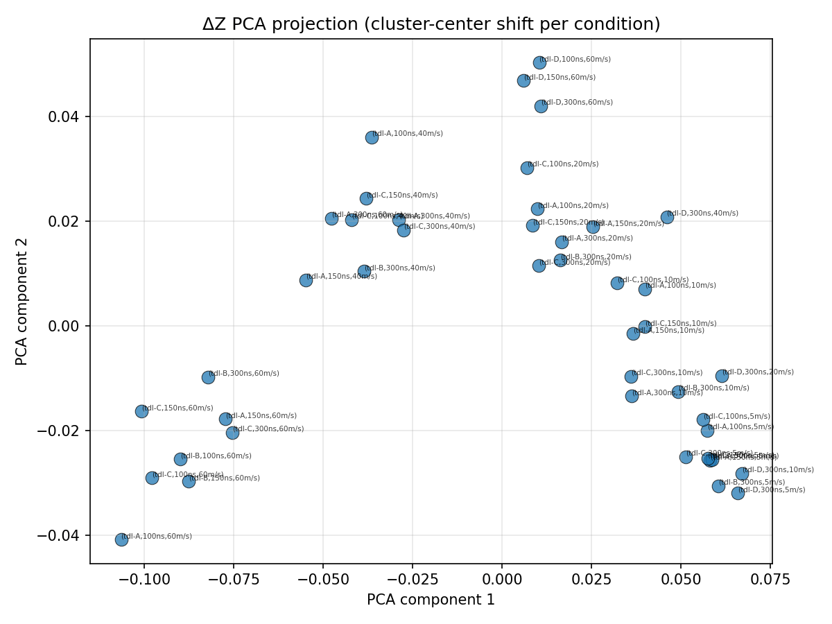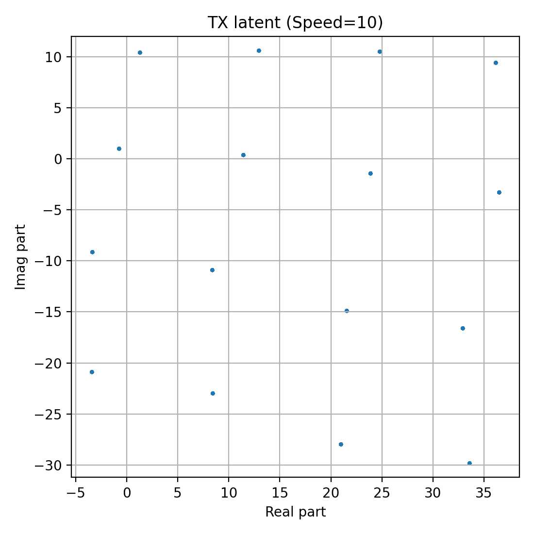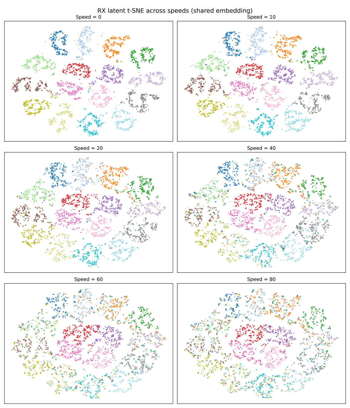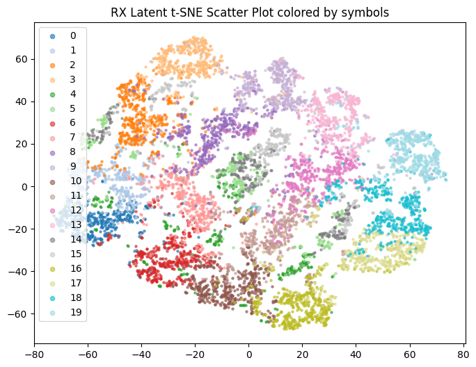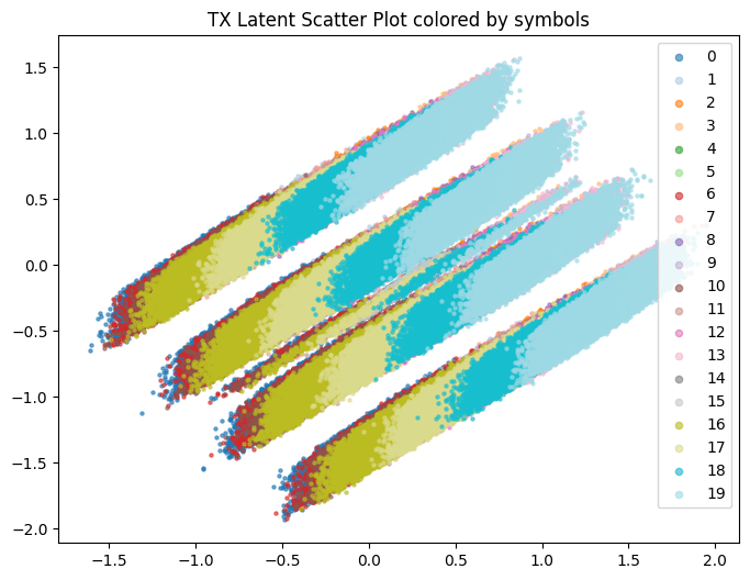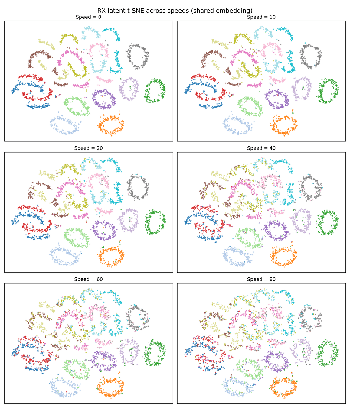 4) NRx(0) with Demapper: Identical configuration as (1), but during training, we only get channel impulse responses with the user speed being 0. Then, during test time, we change the channel model to have speeds of 10,20, etc, and see what happens to the clusters.