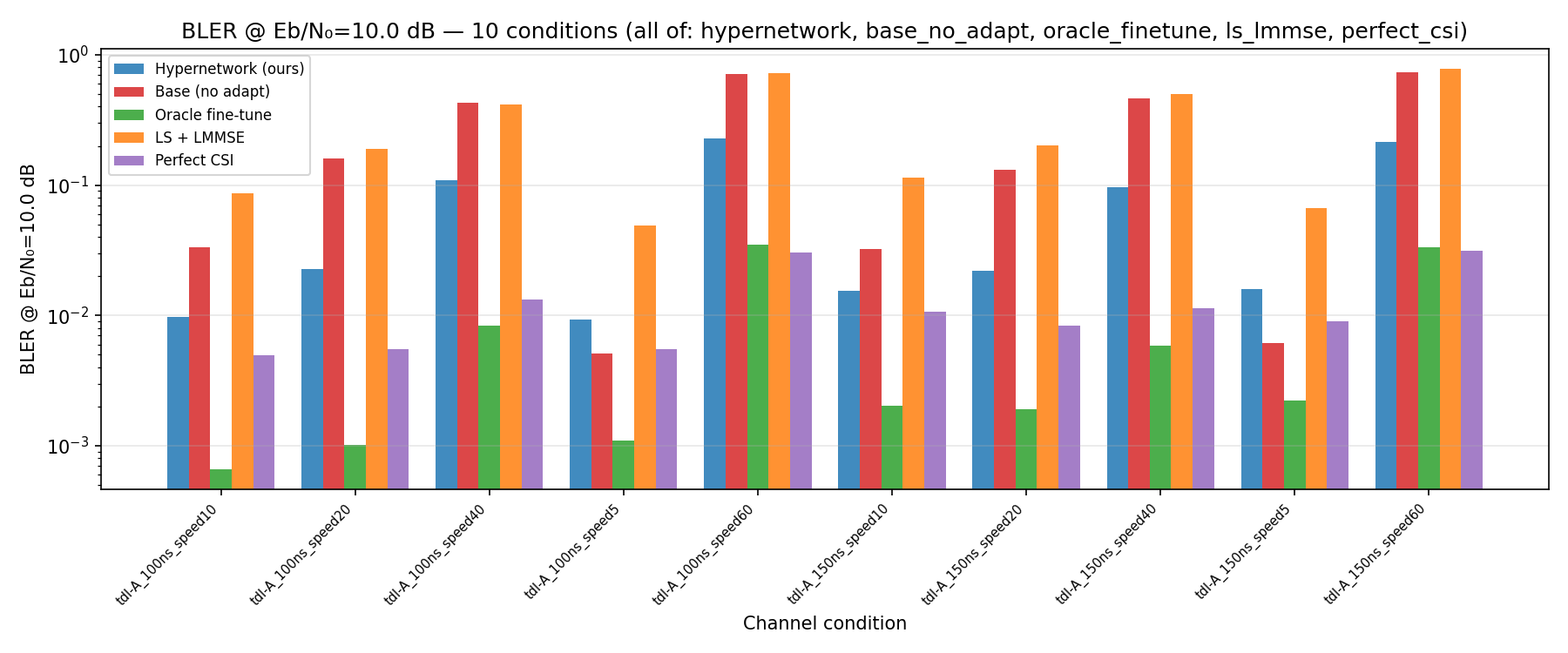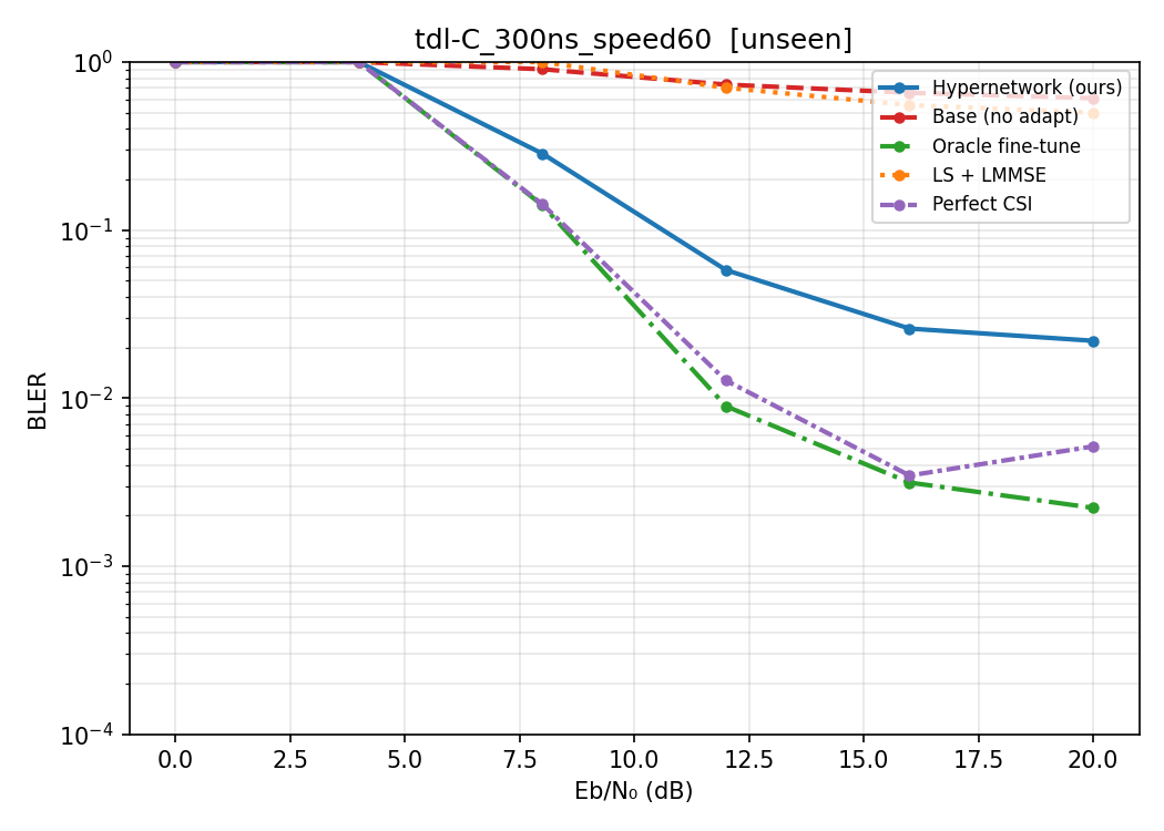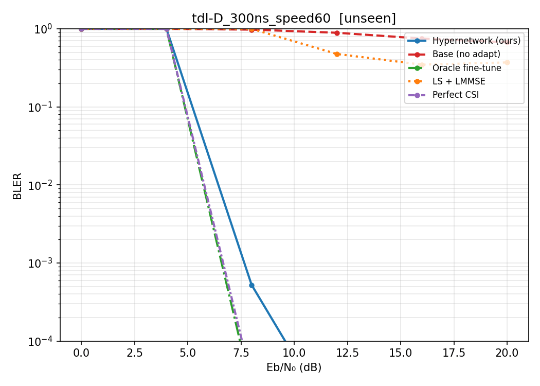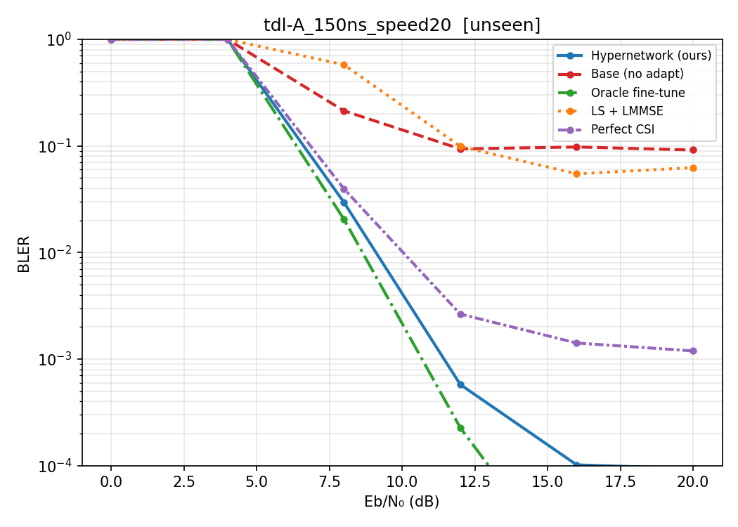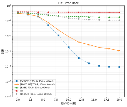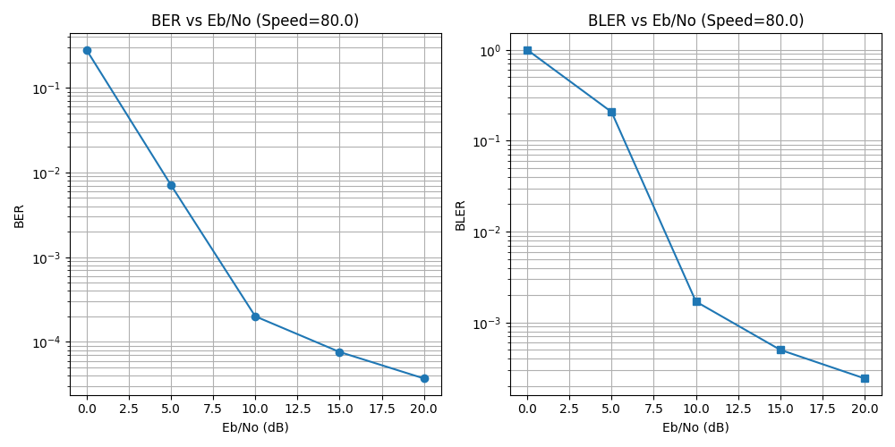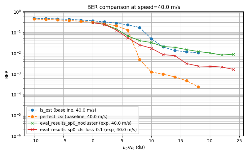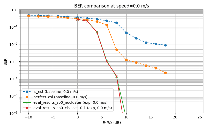 - A light-weight neural modulator is added to the transmitter side, which takes in a 14x128 Resource Grid and gives out another 14x128 modulated Grid. The Receiver side configuration is identical to (1): speed randomly sampled from 0-20, neural_Receiver -> Demapper-> LLRs.