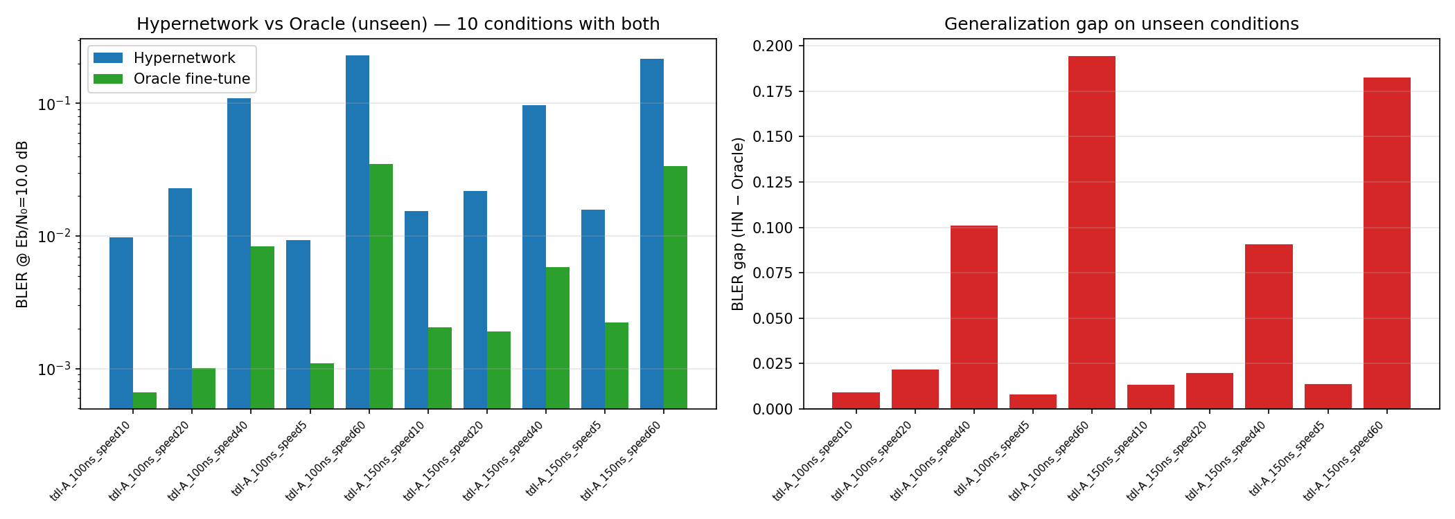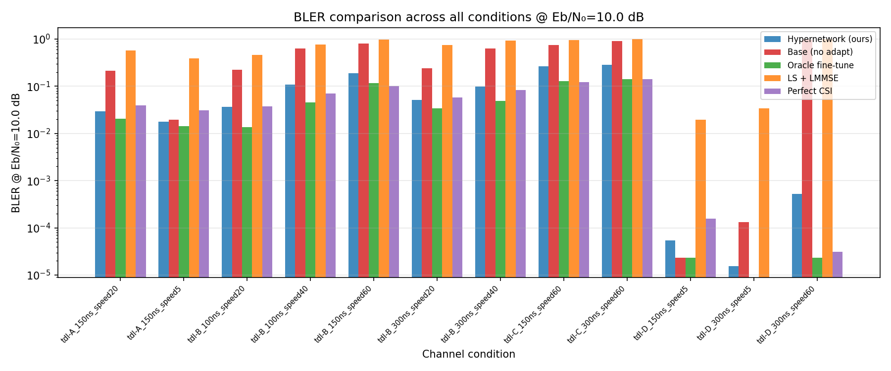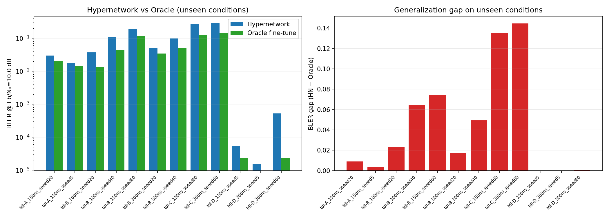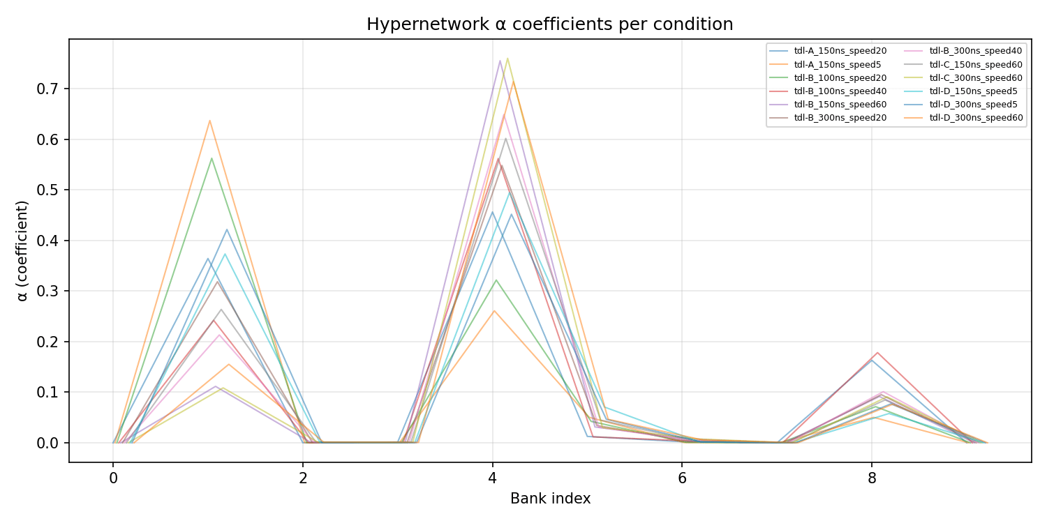 - A light-weight neural modulator is added to the transmitter side, which takes in a 14x128 Resource Grid and gives out another 14x128 modulated Grid. The Receiver side configuration is identical to (1): speed randomly sampled from 0-20, neural_Receiver -> Demapper-> LLRs.