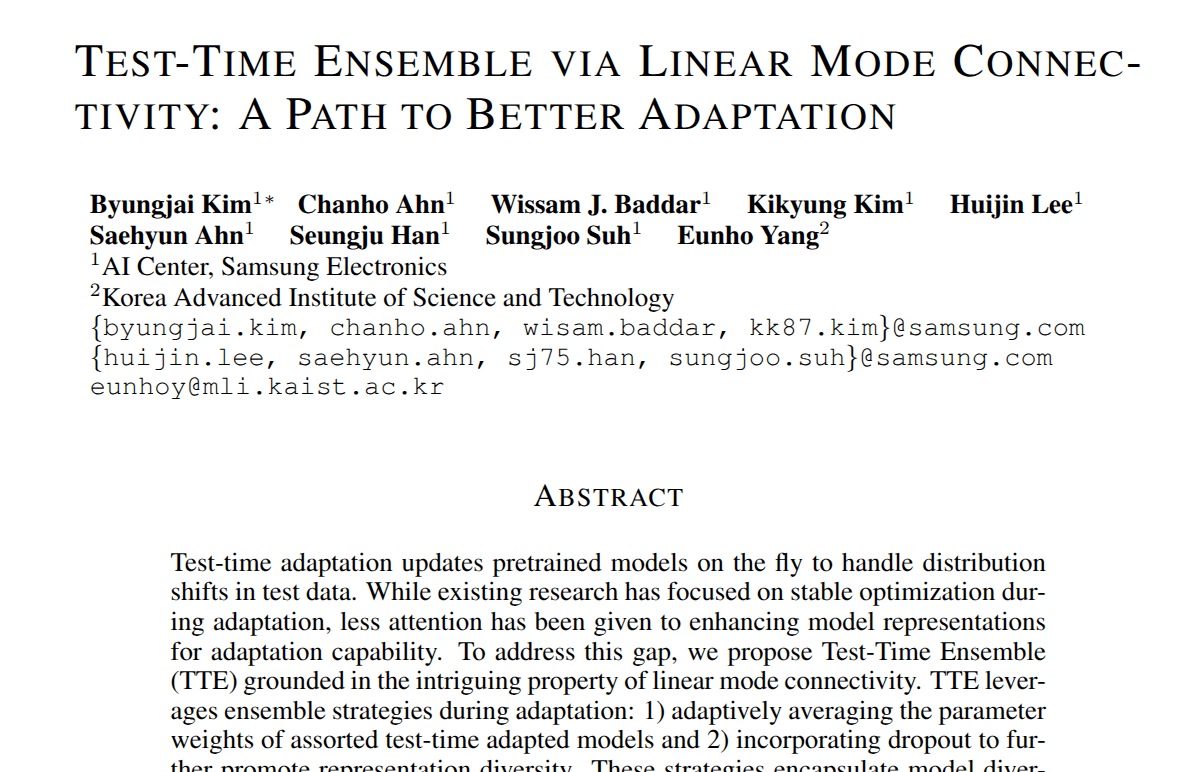 Kim B, Ahn C, Baddar WJ, Kim K, Lee H, Ahn S, Han S, Suh S, Yang E. Test-time ensemble via linear mode connectivity: A path to better adaptation. InThe Thirteenth International Conference on Learning Representations 2025.