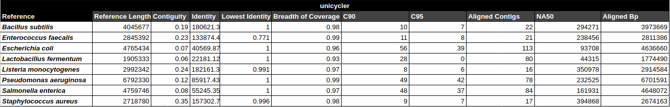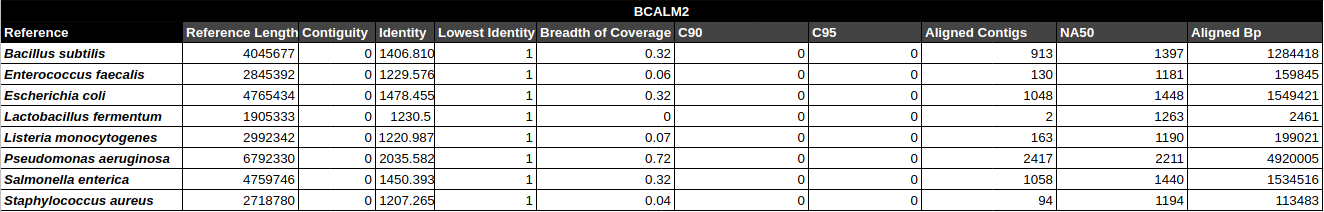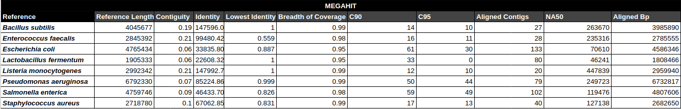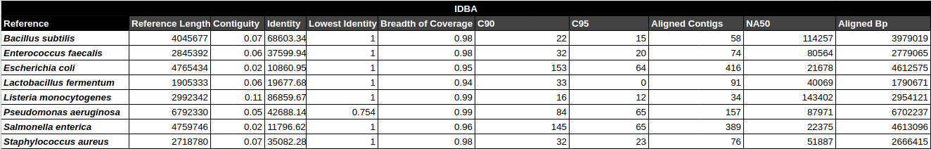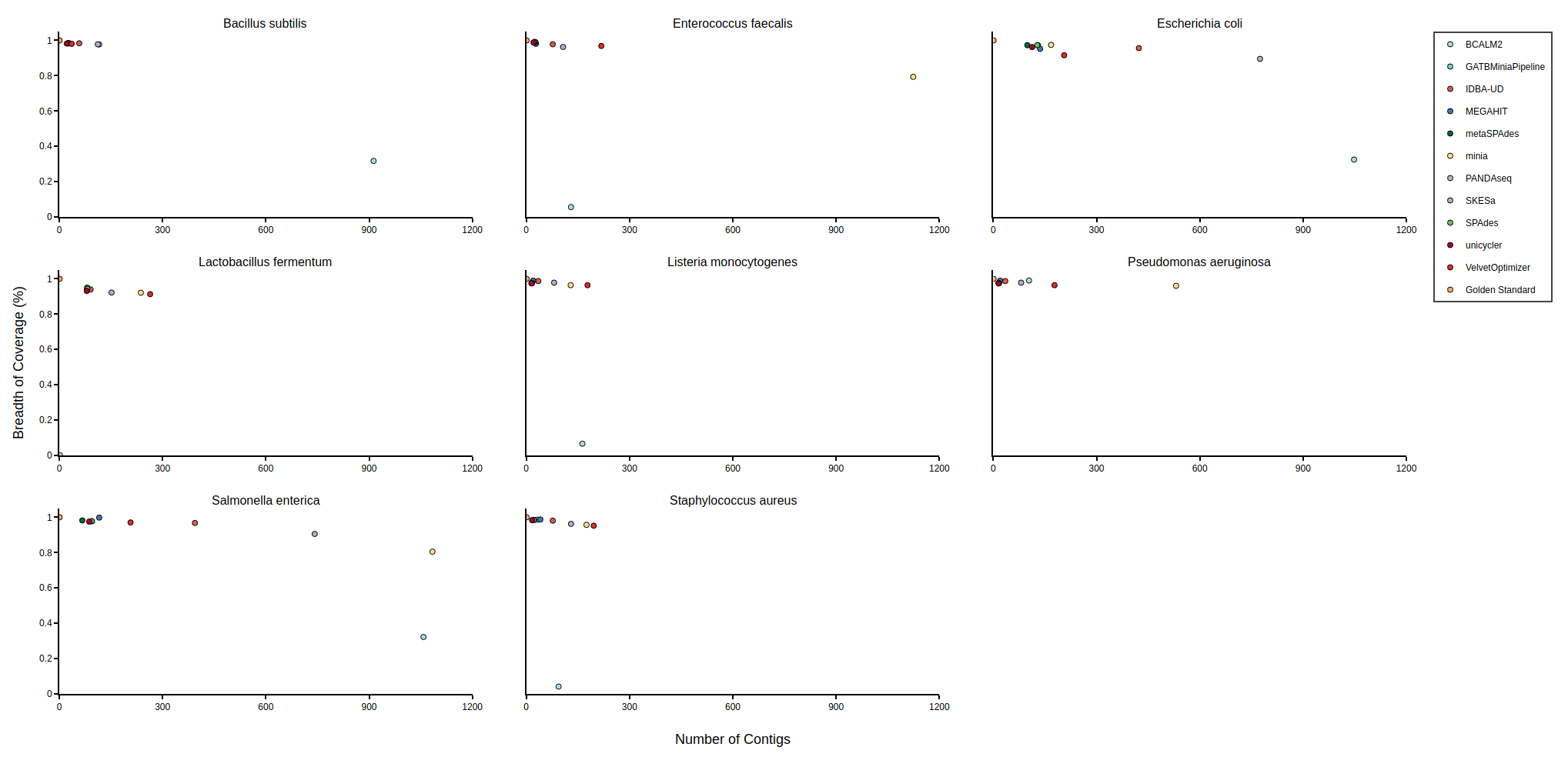 Bradth of coverage and number of contigs per Reference for each Assembler