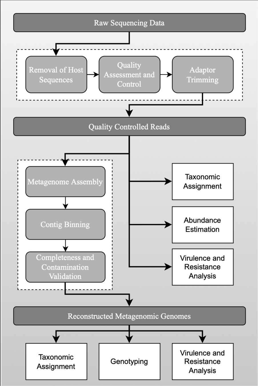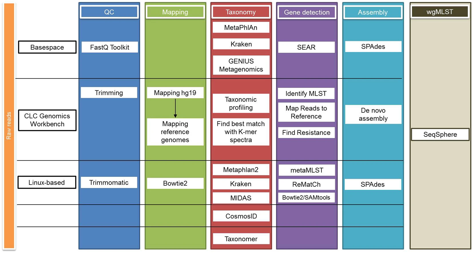 Scheme of the bioinformatic analysis of the metagenomics samples. In order to evaluate and compare the accuracy and reliability of the bioinformatics analyses in providing the closest results to culture and WGS of any cultured isolates, three different pipelines (two commercially and one freely available) were used (Fig. 1). Different tools to perform raw read quality control, filtering and trimming were used and reads were mapped against the human genome (hg19) before performing taxonomic classification. Reads mapping to hg19 were removed from the analysis to increase the efficiency of the bioinformatics tools. Typing (MLST), phylogenetic analysis, plasmid analysis, detection of antimicrobial resistance and virulence genes was performed. To determine the appropriateness of shotgun metagenomics as a predictor of the WGS (chromosome and plasmids), Shotgun metagenomics results obtained were compared with the results of WGS of any bacterial isolates obtained from culturing the sample. Source: Couto et al,. 2018.