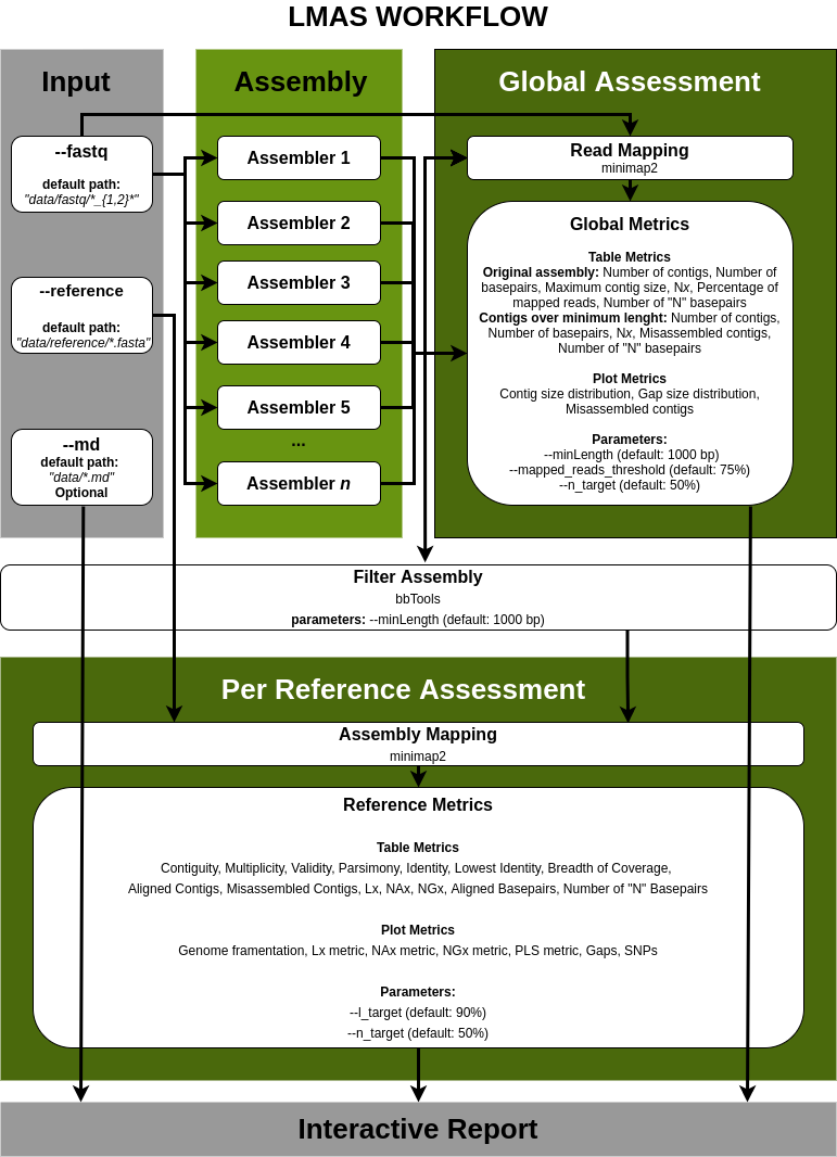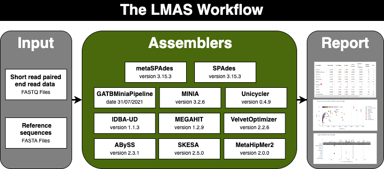 The input data is assembled in parallel by the set of genomic and metagenomic de novo assemblers in LMAS.